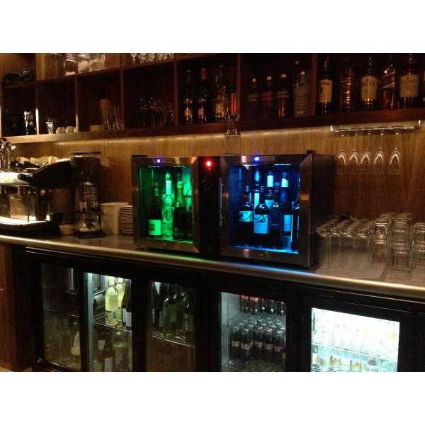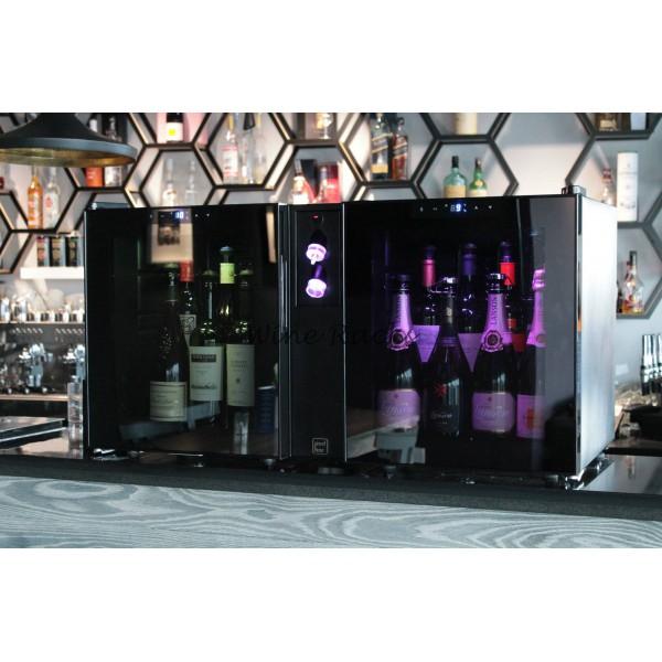 Используются компрессорные винные шкафы на 16 бутылок каждый, однако, при вертикальном хранении помещается по 8 бутылок вертикально и еще по 4 горизонтально на верхней полке. Диапазон температур охлаждения от +4С до +18С, что достаточно для охлаждения вин любого типа. Доработанная внутренняя подсветка позволяет выставить любой из 7 вариантов цветов, для подсветки коллекции и привлечения внимания клиентов.