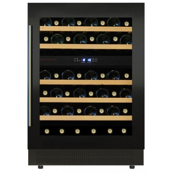Винный шкаф Dunavox DAU-46.146DB - встраиваемый компрессорный  винный шкаф для дома на 46 бутылок с двумя зонами охлаждения со стеклянной дверью черного цвета без рамки.