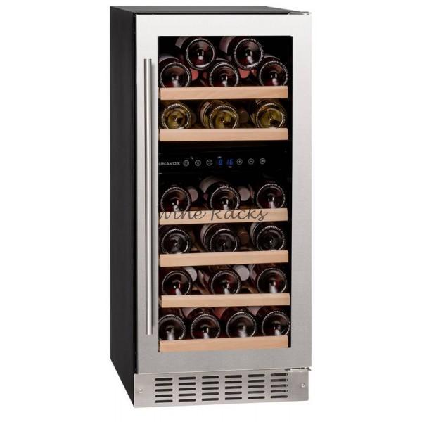 Винный шкаф Dunavox DX-32.88SDSK Cнят с производства - встраиваемый компрессорный винный шкаф для дома на 32 бутылки с 2 зонами охлаждения со стеклянной дверью в рамке серебристого цвета.