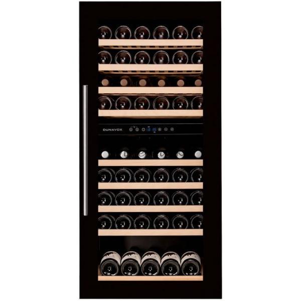 Винный шкаф Dunavox DX-89.215BDBK - компрессорный встраиваемый винный шкаф на 89 бутылки с двумя зонами охлаждения и черной стеклянной дверью.