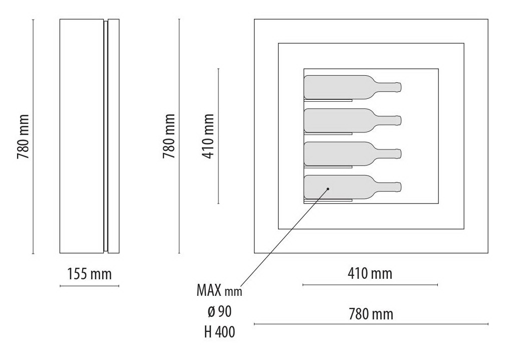Модель Quadro Vino № 40 - это охлаждаемый стенд в стильной рамочке, предназначен для четырёх бутылок в горизонтальном положении.