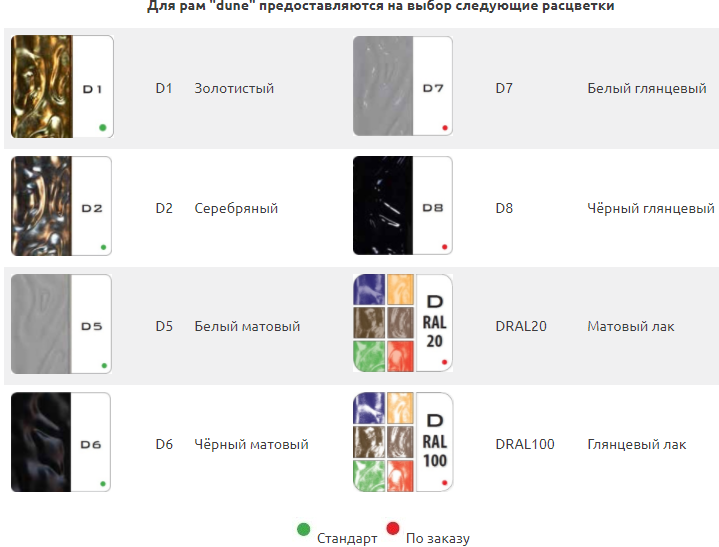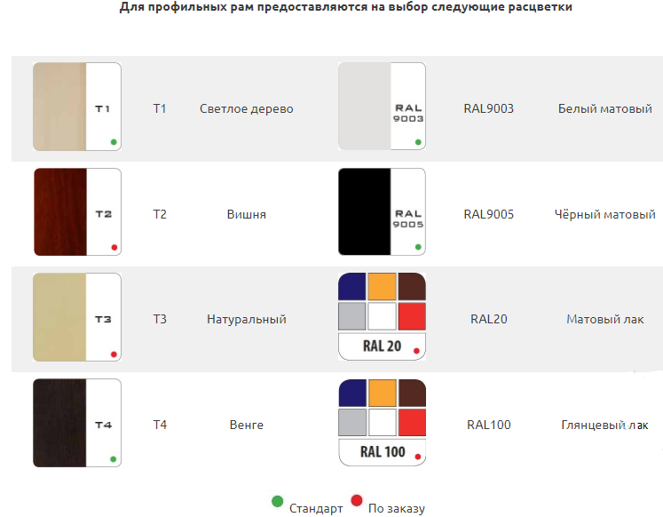 Для профильных рам предоставляются на выбор следующие расцветки: